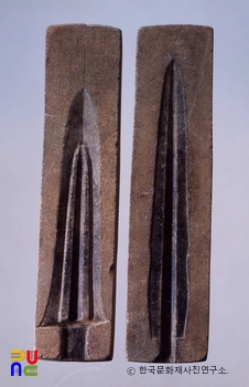 먼저 세형동검(細形銅劍)을 만들었던 한 쌍의 용범이다. 용범 한 쪽의 크기는 34.5㎝×7.4㎝×4㎝이고, 이것으로 만들어낼 구리칼의 길이는 33㎝이다. 많이 사용된 듯 돌이 까맣게 탔고 약간 손상된 부분도 있다.