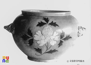 몸체에는 앞뒤로 큼직한 모란이 하나씩 장식되어 있다. 모란꽃은 잎맥까지도 세세하게 묘사되어 있으나, 몸체의 한 면 가득히 큼직하게 시문되어 있어서 시원한 느낌을 준다. 꽃은 흰색으로, 잎은 검은색으로 상감하였으며, 잎은 꽃을 중심으로 좌우상하로 대칭되게 배열되었다. 흑백의 대비가 강한 꽃과 잎이 차지하는 면적이 기면에 비하여 넓은 편이다.